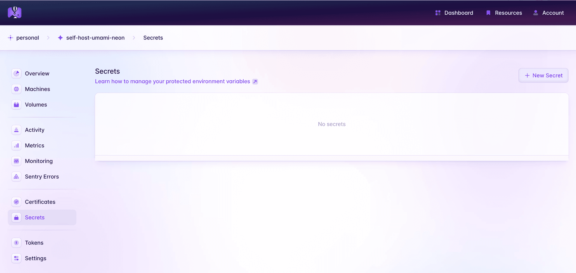 Click on Secrets in the left sidebar, and then click on New Secret on the top right corner to start creating an environment variable for your app.
